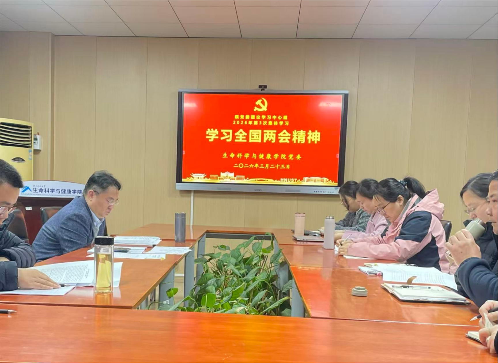3月23日上午,yl23411永利集团官网党委理论学习中心组在生物楼110举行2026年第三次集体学习(扩大)会,深入学习贯彻全国两会精神。院党委书记龙赢主持会议并总结发言,学院党委理论学习中心组成员、三办主任、教工党支部书记、组织员参加学习。