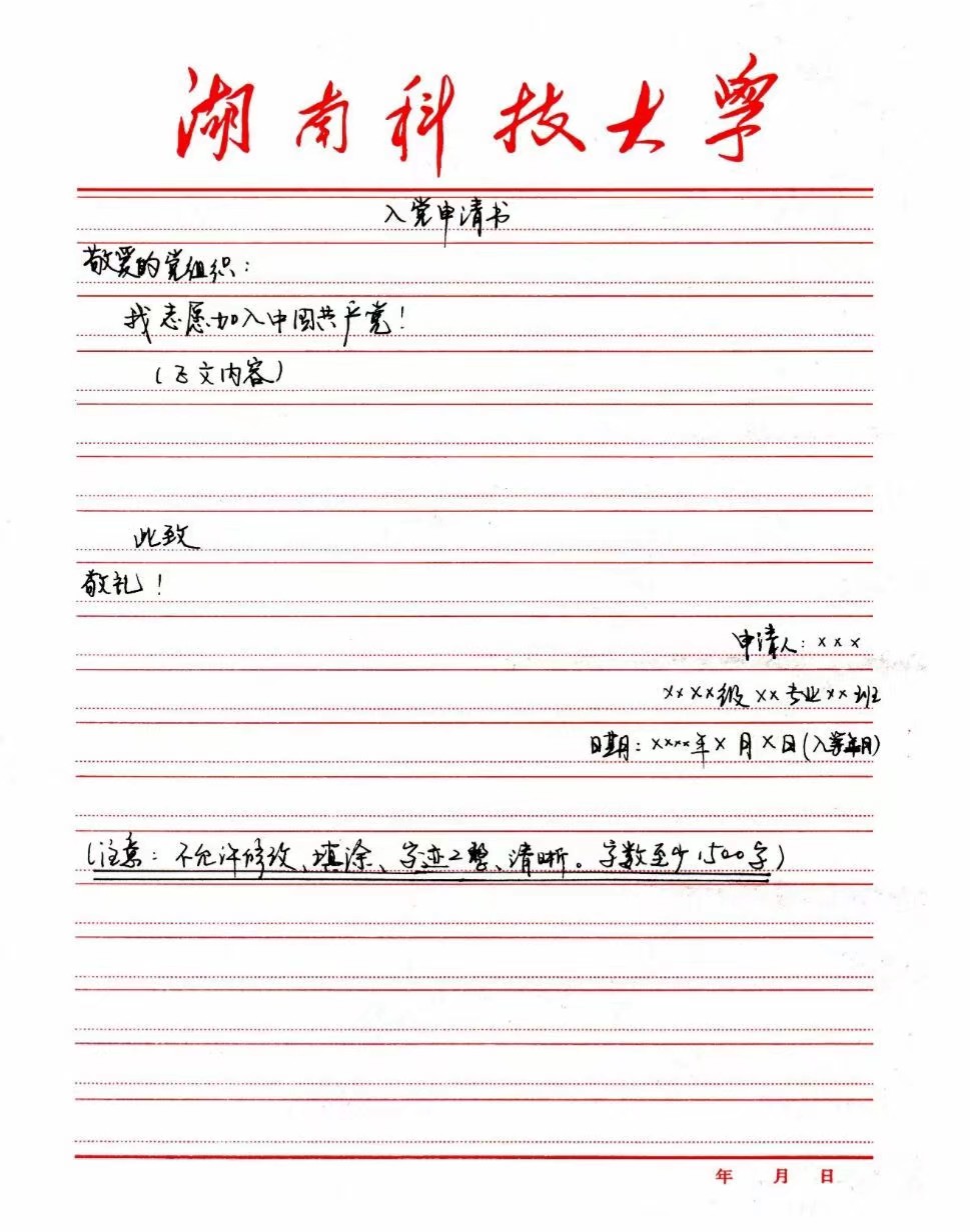(4)申请书要写得朴实、庄重,不要追求华丽的辞藻,夸夸其谈。对基本写法正文中各部分的内容可根据自己的实际情况掌握。入党申请书由申请入党的同志亲笔书写。因特殊原因需要打印的入党申请书,申请人必须亲笔签名盖章或按手印。入党申请书无论亲笔书写的,还是电脑打印的,均应由申请人本人亲自交给党组织。如因文化程度低、病重、残疾或其他特殊原因,不能亲自书写的,可以由本人口述,请别人代写,但要说明不能亲自书写的原因,经申请人署名盖章或按手印后交给党组织。