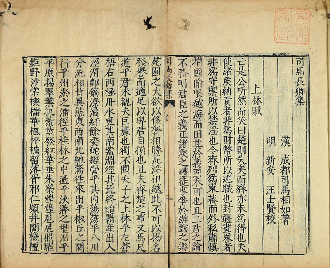 司马相如早期人生并不得意,郁郁寡欢时写下了《子虚赋》,通过文学化的想象,营造了一座可以供诸侯国君主游玩与享用的人间乐园,但并没有引起多大注意。后来由其同乡引荐给汉武帝而获得独特青睐,并在汉武帝的期盼和鼓励下,又撰写了《上林赋》。两赋遂成姊妹篇。《上林赋》上承《子虚赋》所述,当子虚、乌有二先生互相夸耀楚、齐时,亡是公以天子代表的身份,申明诸侯国应纳贡述职的道理,又极力渲染了天子上林苑的广阔和天子出猎的壮观。然后,笔锋一转,叙述天子对“大奢侈”幡然省悟,命令“解酒罢猎”,使子虚、乌有“愀然改容”,有所悔过。全赋规模宏大,辞汇丰富,描绘尽致,渲染淋漓。