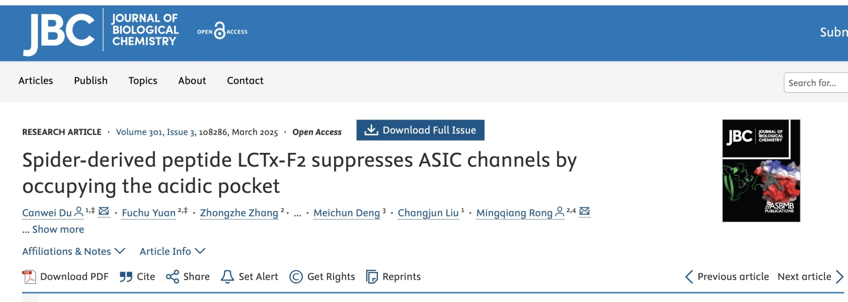 近日,yl23411永利集团官网杜灿伟博士与湖南师范大学容明强教授团队合作揭示了蜘蛛多肽LCTx-F2作用于酸敏感通道ASICs的分子机制,相关研究成果以“Spider-derived peptide LCTx-F2 suppresses ASIC channels by occupying the acidic pocket ”为题,正式发表于自然指数期刊(Nature Index) J. Biol. Chem上。