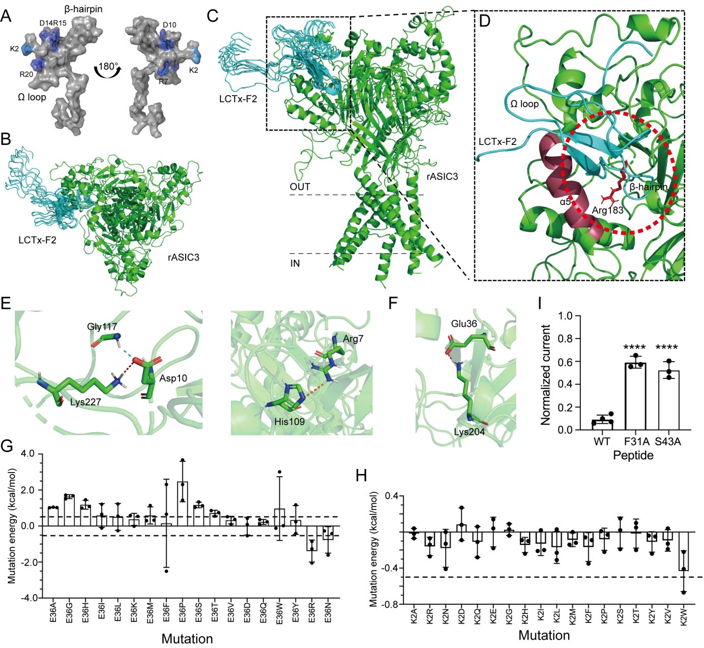 离子通道在诸多生命调控过程中发挥着重要作用,其中酸敏感通道ASICs是一类受质子激活的钠离子通道,在中枢和外周神经系统中有着广泛表达;酸敏感通道ASICs参与疼痛感受,ASIC3通道更被认为是具有前景的镇痛药物靶点。前期研究工作发现蜘蛛多肽LCTx-F2能够以不同的结合方式作用于凝血因子FXIIa和凝血酶上,具有作为促凝血药物开发的潜力(Biomed Pharmacother. 2023 Oct;166:115421)。近期研究发现,该多肽能够抑制ASIC3和ASIC1a通道,并具有浓度依赖关系;结合多肽定点突变技术、分子对接及动力学模拟分析,发现多肽LCTx-F2的β-发卡结构能够结合到ASIC3通道的酸性口袋,而多肽LCTx-F2作用于ASIC1a通道时则其N-末端结合到该酸性口袋。该研究揭示了多肽LCTx-F2抑制酸敏感通道的分子机制,为相关靶向镇痛药物的研发提供了一个新的分子模板。