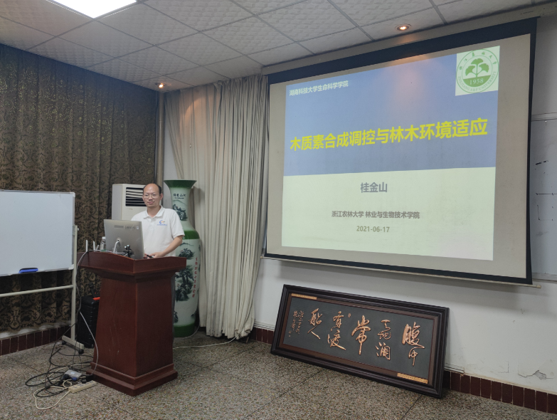 2021年6月17日学院邀请中国科学院分子植物科学卓越创新中心研究员、浙江农林大学教授、国家自然科学基金优秀青年基金获得者桂金山博士来yl23411永利集团官网讲学,并作题为“木质素合成调控与林木环境适应机制研究”的学术报告。yl23411永利集团官网部分教师与研究生参加了此次报告会,报告会由彭佳师博士主持。
