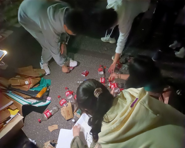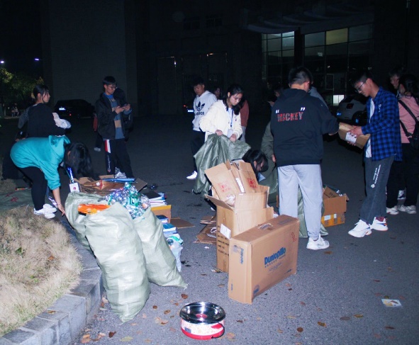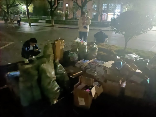 志愿者们将废品进行分类打包,然后一点一点的运到集合点,校园里面的街道上都是志愿者们忙碌的身影。手中的重量不少,脚下的路途不远,但志愿者们都毫无抱怨,将自己的任务完成后主动去帮助别人,提高了不少效率。