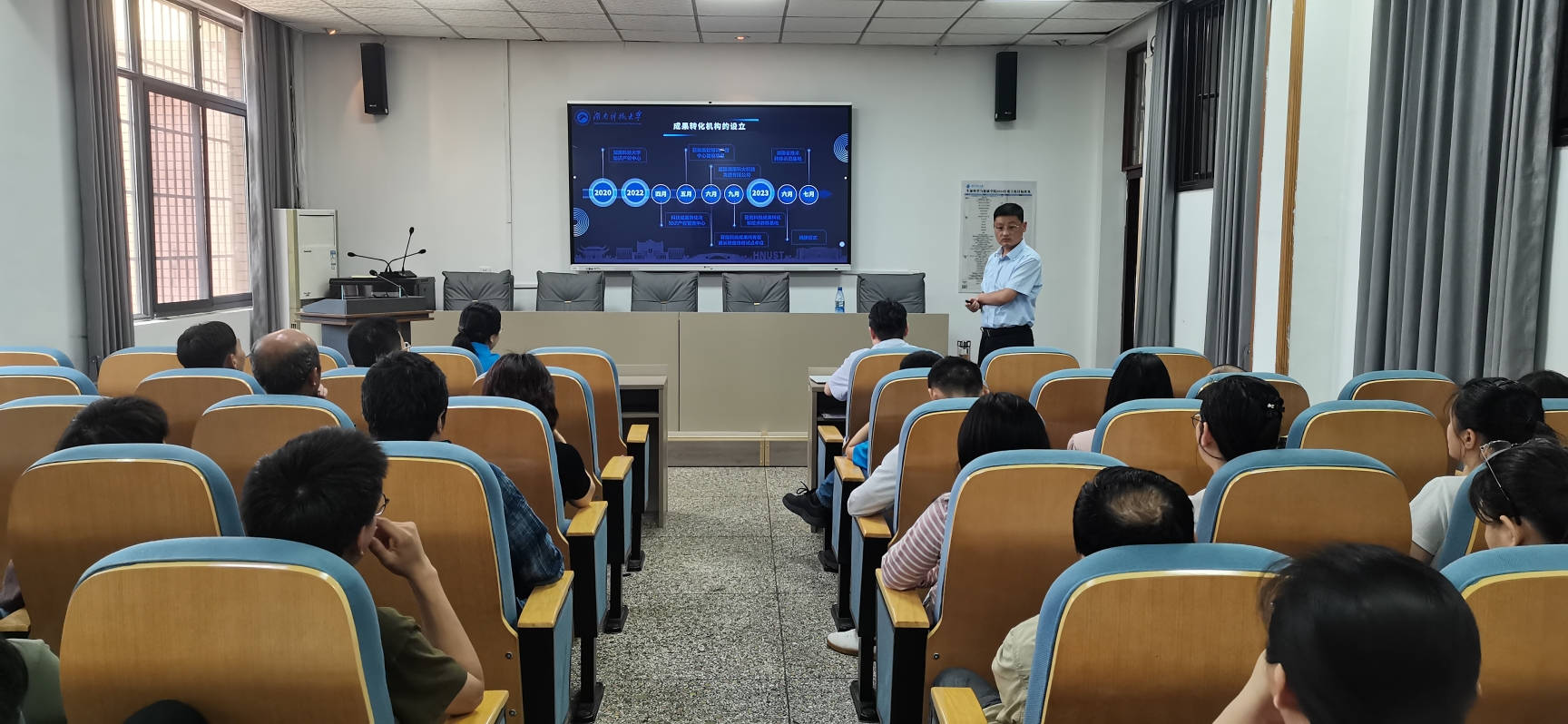 张道兵主任首先对我校近年来在科技成果转化工作中取得的显著成效进行了介绍。他指出,一方面,国家、各级政府和学校均已出台了一系列政策措施,加大对科技成果转化的支持力度,为科研人员提供了更多的创新空间和资金支持。另一方面,科研机构和企业积极加强合作,共同探索科技成果转化的新路径,推动了一批具有市场前景的科技成果转化为现实生产力。