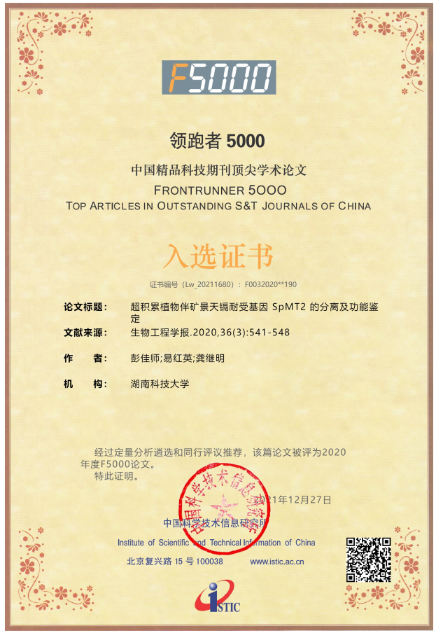 近日,国家科技部中国科学技术信息研究所公布了2020年度“领跑者5000—中国精品科技期刊顶尖学术论文(F5000)”入选名单。经定量分析遴选和同行评议推荐,我校yl23411永利集团官网彭佳师博士完成的论文“超积累植物伴矿景天镉耐受基因 SpMT2 的分离及功能鉴定”入选,该论文发表在2020年度的《生物工程学报》(第36卷第3期)上。