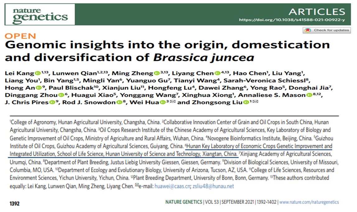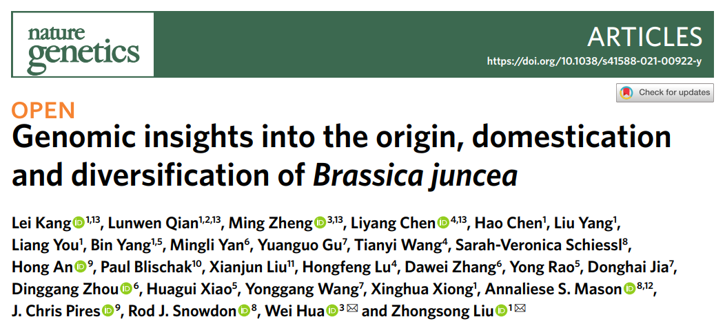 由湖南农业大学刘忠松教授团队牵头,yl23411永利集团官网严明理老师团队参与的芥菜(芥菜型油菜)种质资源收集、鉴定评价种子颜色基因等方面的研究在9月6日研究论文形式在Nature Genetics发表Genomic insights into the origin, domestication and diversification of Brassica juncea,论文全文见https://www.nature.com/articles/s41588-021-00922-y.pdf。该研究解析了黄籽油菜基因组,破解了芥菜身世之谜,揭示了芥菜形态的百变之源,为芥菜基因组选择育种奠定了坚实基础该研究解决了芥菜起源的百年之争,揭示了芥菜形态多变之源,为芥菜基因组育种奠定了基础。