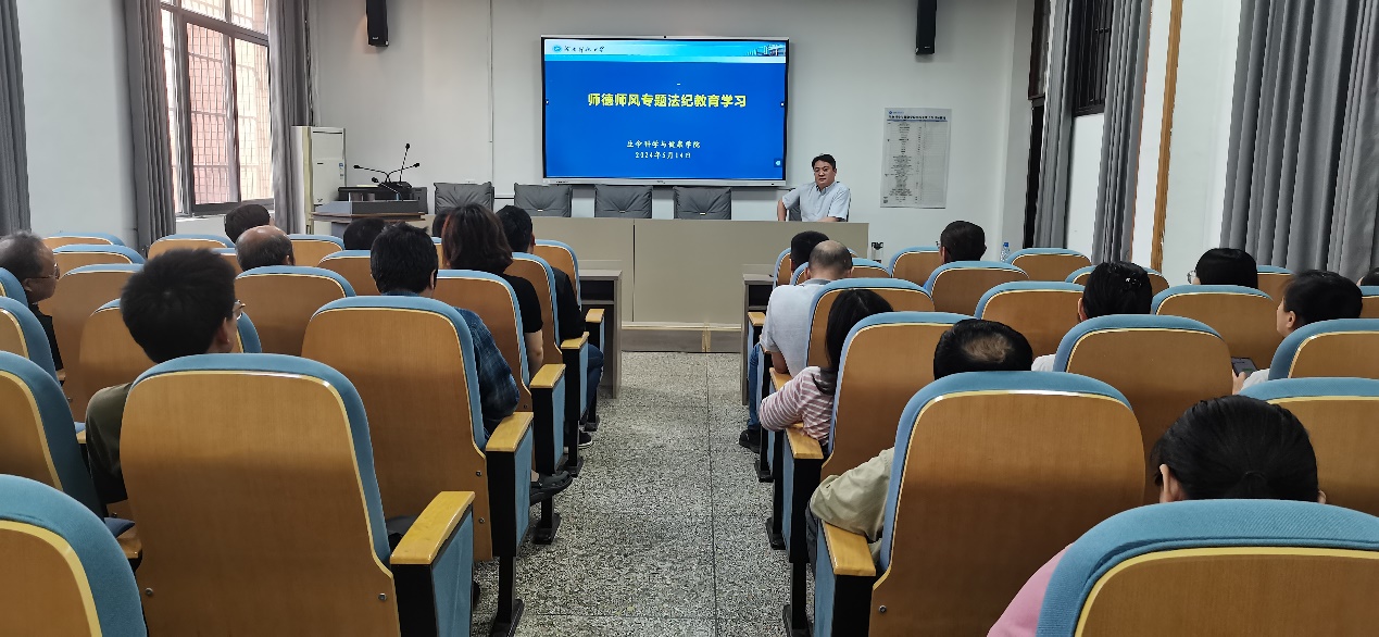 在学校开展党纪学习教育中,yl23411永利集团官网借机狠抓强化师德师风专题法纪建设。5月14日下午在105会议室开展师德师风专题法纪教育学习,院党委书记龙赢主持会议,全院教职工参加。