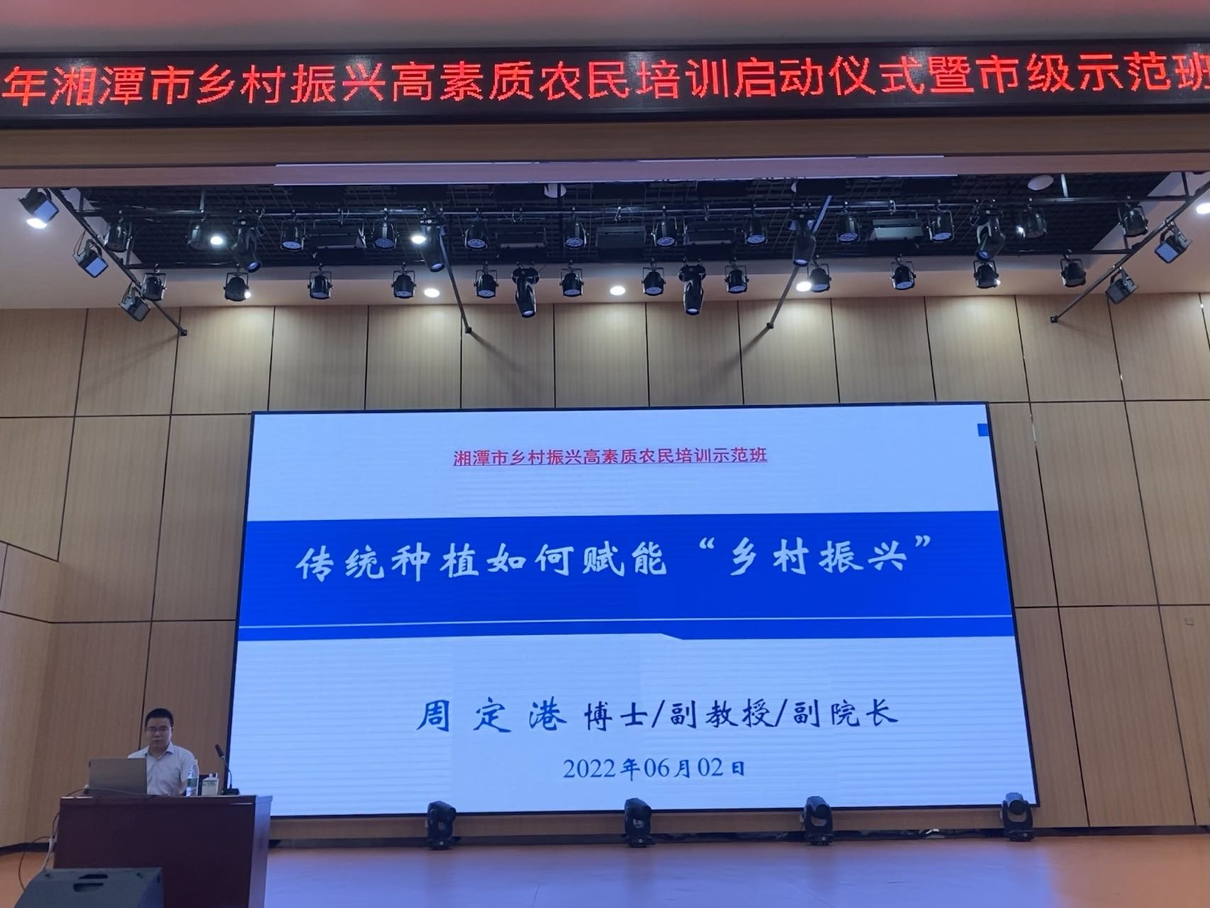 6月2日上午,yl23411永利集团官网副院长周定港副教授在2022年湘潭市乡村振兴高素质农民培训市级示范班开讲。本次乡村振兴高素质农民培训示范班由中共湘潭市委组织部主办,湘潭生物机电学校承办。
