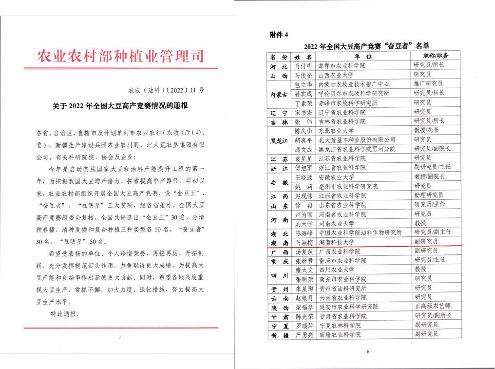 12月30日,农业农村部种植业管理司发布了《关于2022年全国大豆高产竞赛情况的通报》,yl23411永利集团官网马淑梅副教授(原副研究员)荣获“2022年全国大豆高产竞赛“奋豆者”奖项。